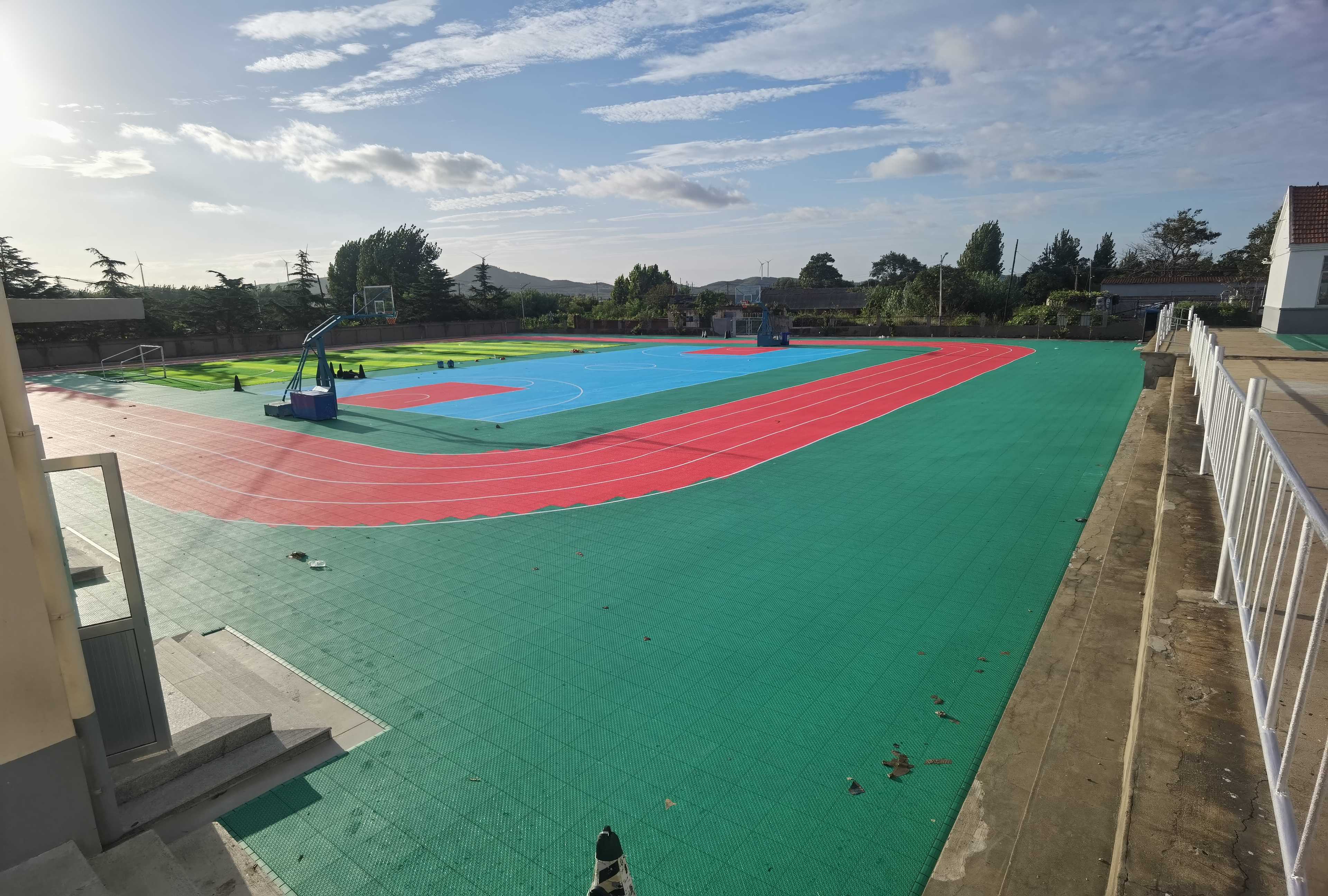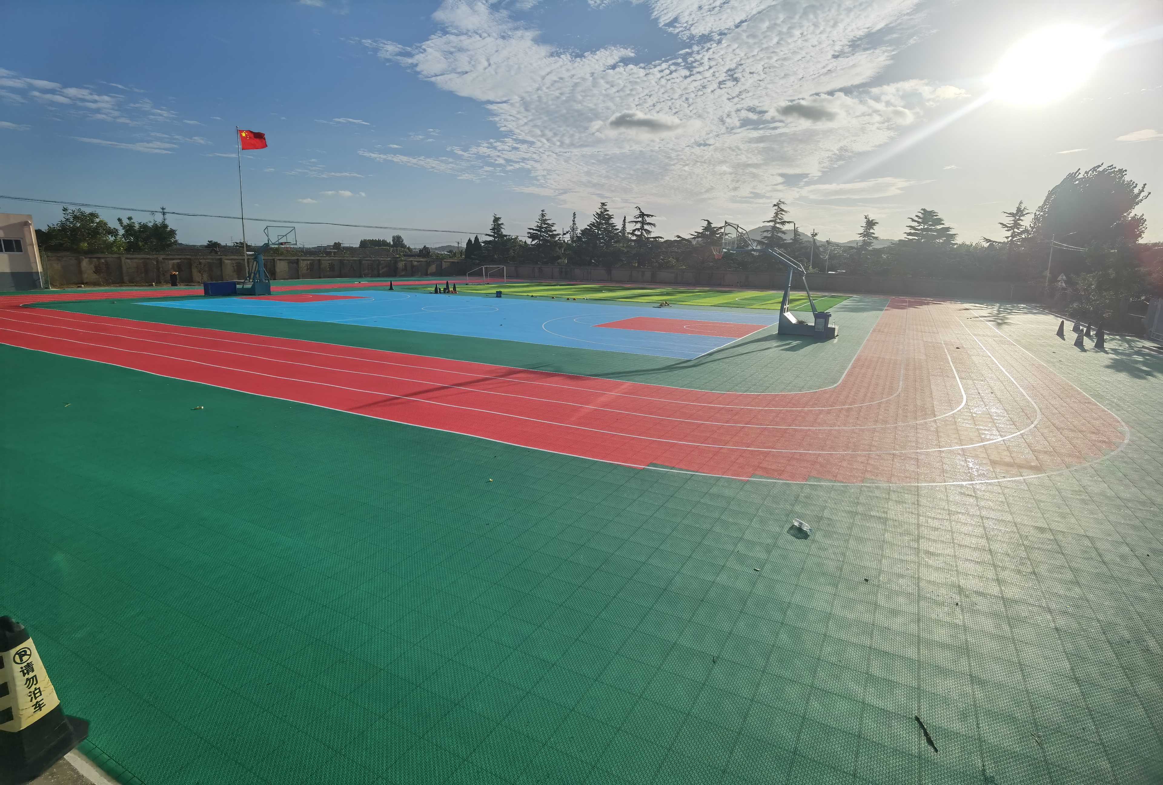 据项目施工方介绍,该悬浮操场总面积达 3000 平方米,完全适配中学体育教学与课余活动需求。场地采用食品级聚丙烯(PP)锁扣式地板,全程无胶水、无焊接拼装,6 名施工团队仅用 3 天便完成整体铺设,较传统塑胶操场建设周期缩短 70%,且施工过程零噪音、零污染,不影响校园正常教学秩序。地板表面设有防滑纹理与缓冲结构,冲击吸收性能达国际运动场地标准,能有效减少学生运动时的磕碰伤害;同时地板具备优异的耐候性,高温不褪色、雨天不积水,确保全年稳定使用。